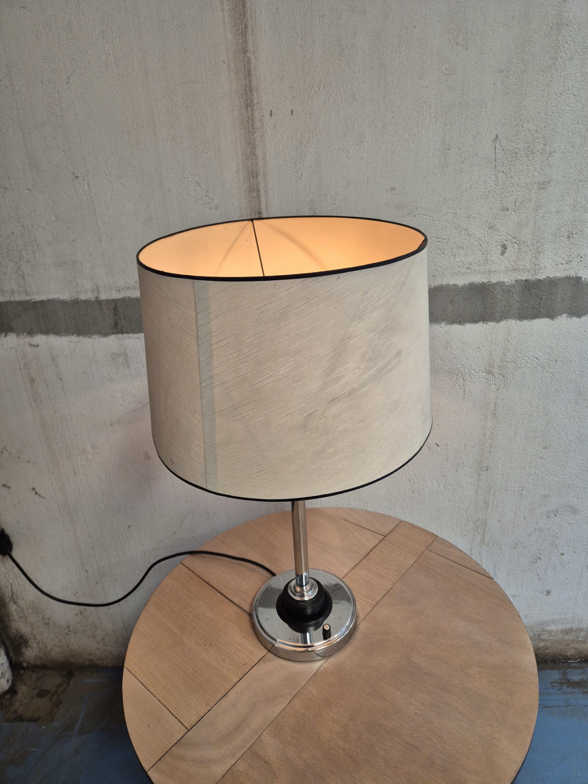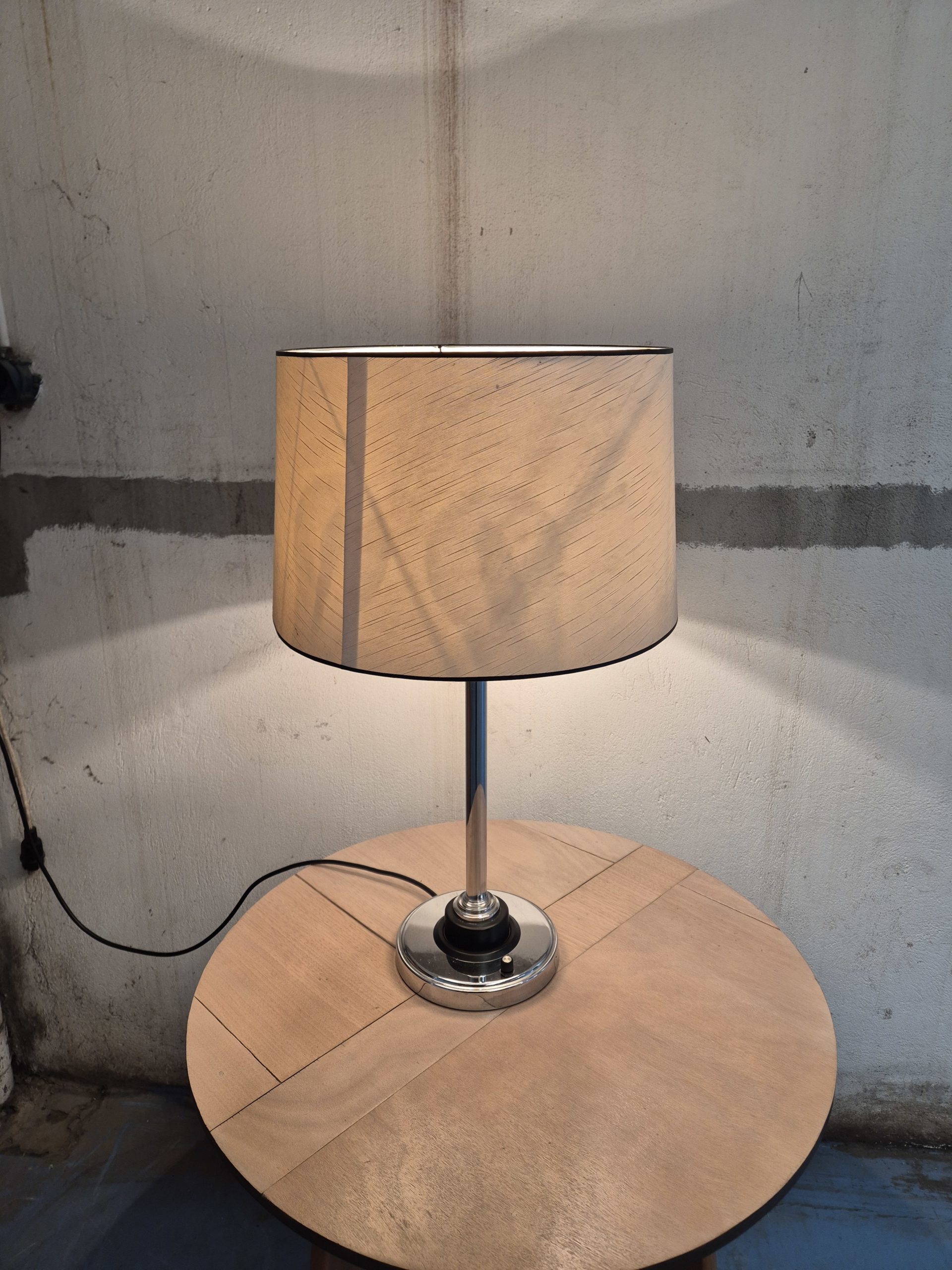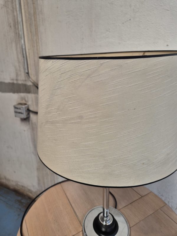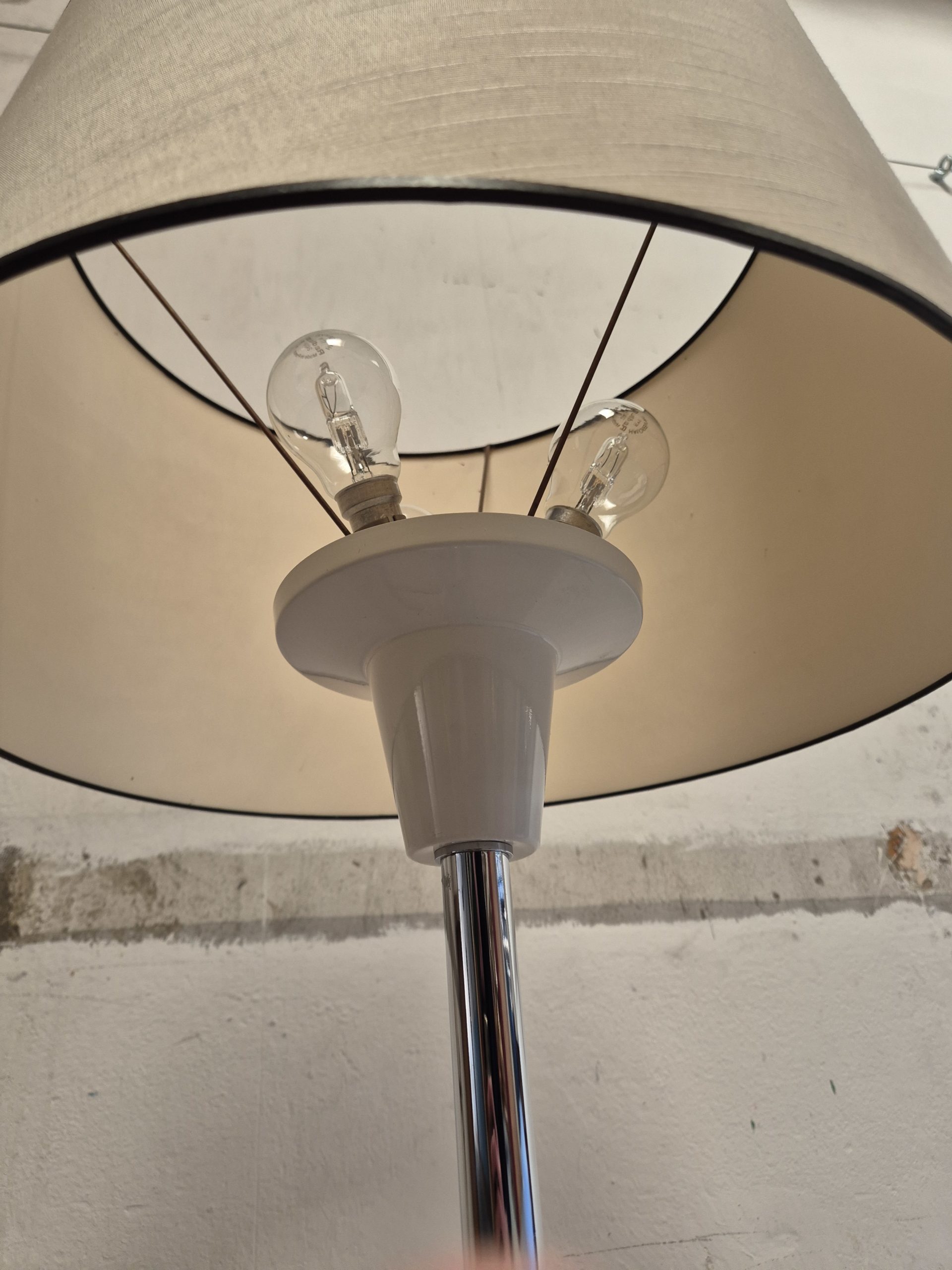 Lampe à poser avec pied chromé par Arlus. Équipée de trois ampoules, elle permet de gérer la luminosité selon les besoins. L’abat-jour présente quelques légères taches.